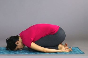 - Espirando assumi Balasana, la posizione del bambino. In questo momento stai allungando i muscoli posteriori, soprattutto la zona lombare. Concentrati sul rilassamento delle spalle, delle braccia e del collo. Lascia andare le braccia dietro volgendo il palmo delle mani verso l’alto. Poggia la fronte a terra e cerca di respirare portando l’attenzione ai muscoli dorsali. Per saperne di più sul significato di Balasana, clicca qui.
