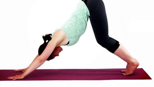 - Torna nella posizione del gatto, ma solo in modo transitorio perché espirando andrai in Adho Mukha Svanasana, la posizione del cane a testa in giù. Inizialmente, prendi confidenza con la posizione mantenendo le ginocchia flesse come vedi in foto, allungando la schiena, aprendo il torace e osservando l’ombelico. Quando ti sentirai a tuo agio, puoi anche cercare di poggiare i talloni al tappetino.