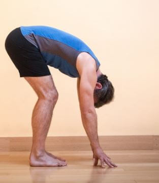 - Dopo un paio di minuti, cammina con i piedi verso le mani fino ad entrare in Uttanasana. Inizialmente puoi lasciare le ginocchia flesse facendo cadere pesantemente le braccia. Dopo profonde espirazioni, cerca di stendere quanto possibile le gambe, il collo è sempre libero da tensioni.