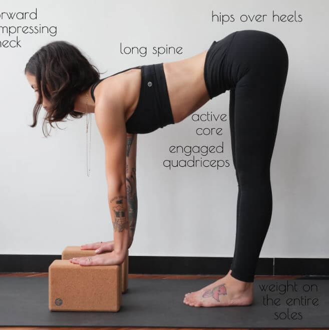 - Da Uttanasana, entra in Ardha Uttanasana aiutandoti con un supporto posizionato sotto le mani come vedi in foto. Se hai necessità di acquistarne uno clicca qui . Questa postura ti aiuterà ad allungare e potenziare i muscoli delle gambe e della schiena. L’esercizio sarà efficace solo se riuscirai ad appiattire ed allungare la i muscoli dorsali il più possibile, immagina di avvicinare il torace al pavimento inspirando.