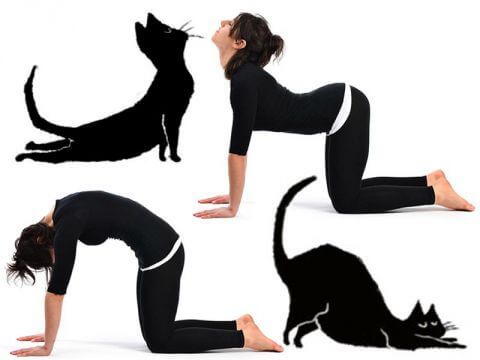 - Inizia dalla posizione del Gatto, in quadrupedia. Parti così: cerca di allineare le spalle sopra i polsi, apri bene le mani, poni una leggera forza sotto i polpastrelli, apri le ginocchia quanto l’ampiezza dei fianchi e poggia il dorso dei piedi. La fronte guarda verso il basso e il collo è libero da tensioni. Cerca di aumentare l’ampiezza del respiro e allungare i muscoli della schiena. Cerca di seguire il movimento della tua schiena, inspirando guardi avanti e inarchi la zona lombare ed espirando curvi la schiena, porti l’ombelico verso la colonna con la spinta dell’addome e guardi verso il basso.