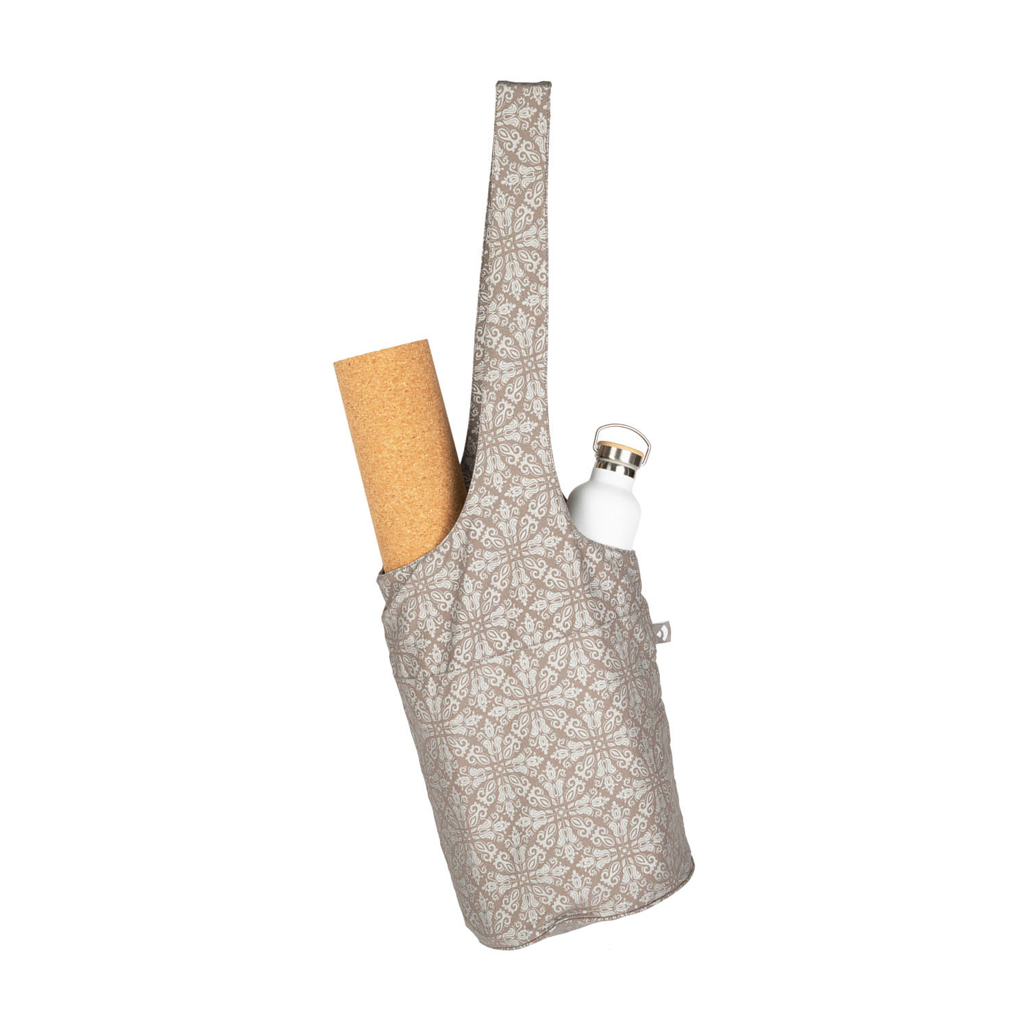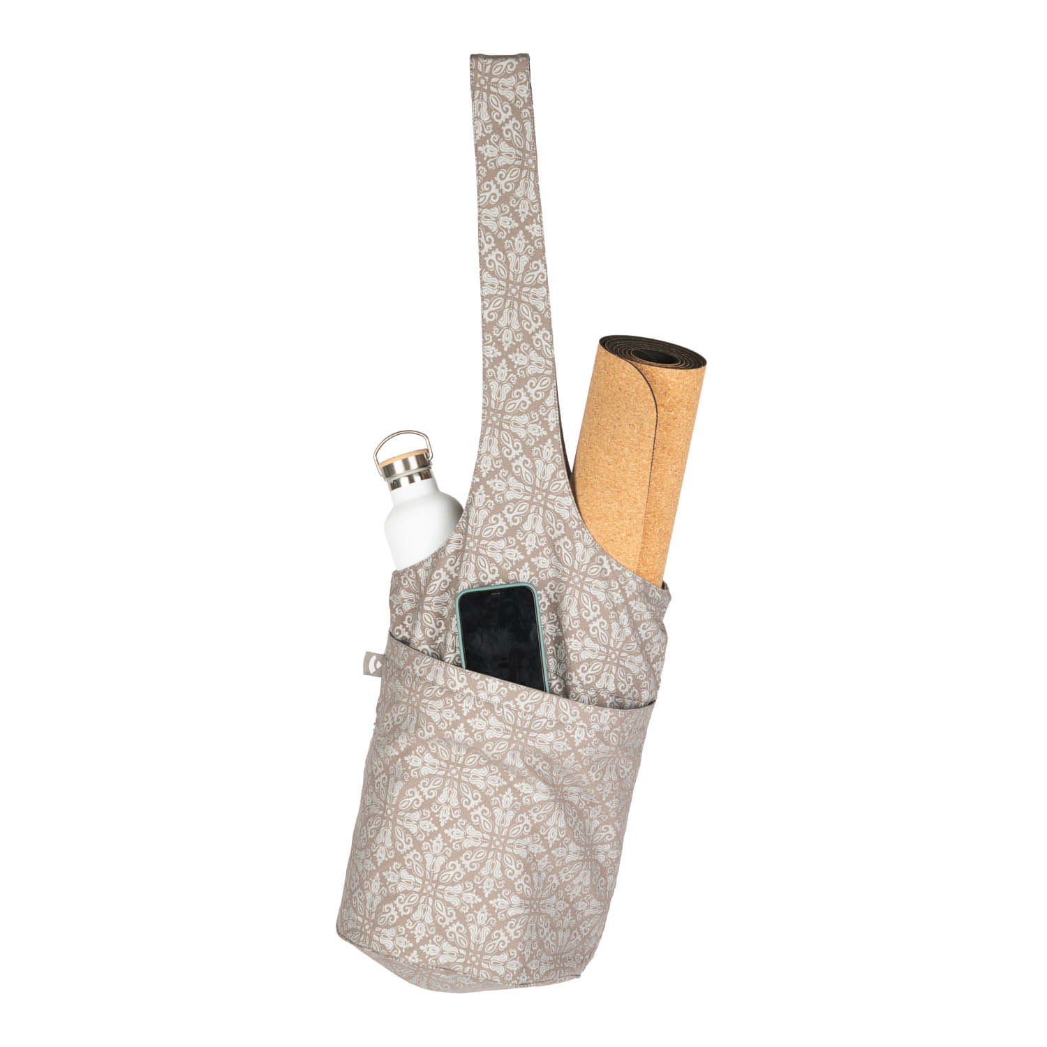Le forme arrotondate della borsa, realizzata in cotone e presentata in un colore "taupe", assicurano un aspetto armonioso e una vestibilità comoda. Gli ornamenti stampati in argento aggiungono punti salienti, rendendo la borsa yoga un'attraente attrazione.