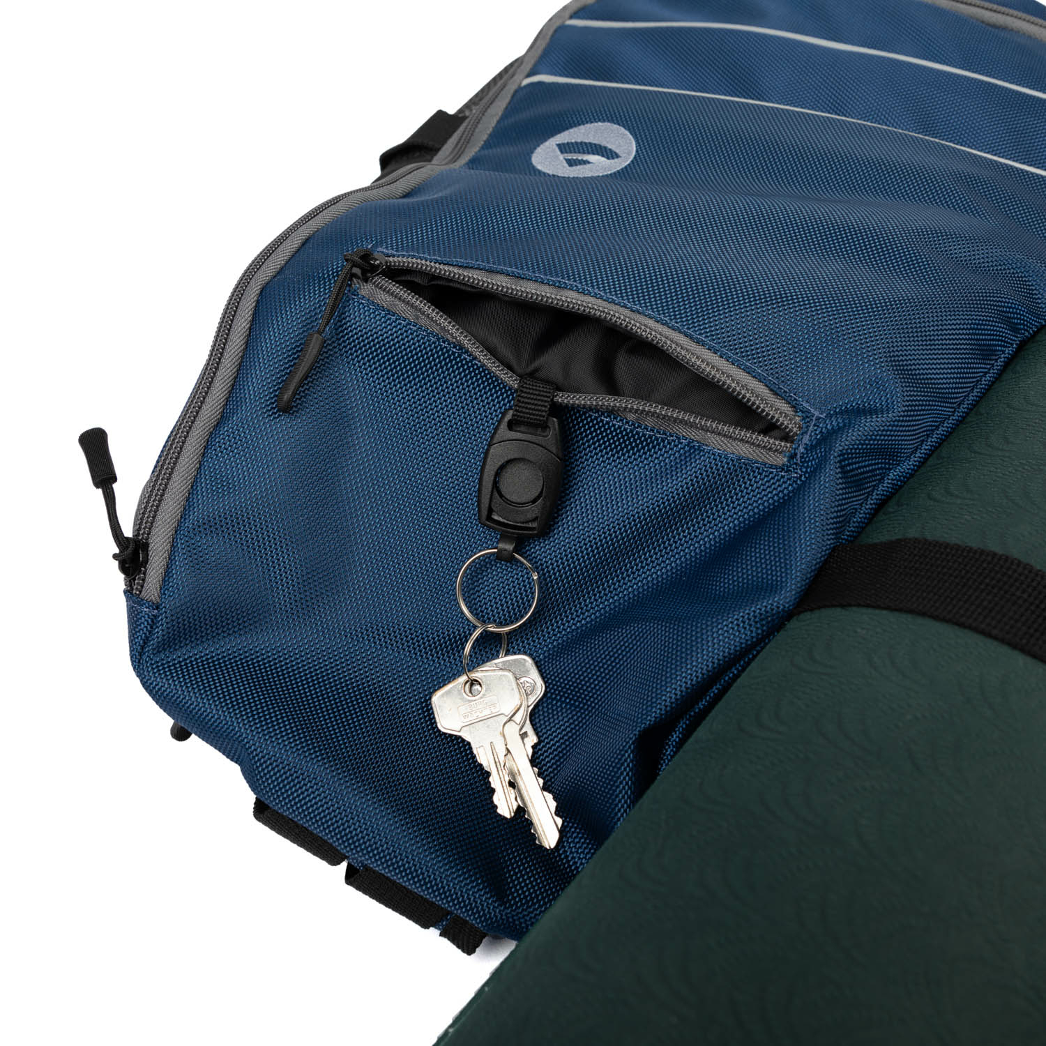Particolarmente utili sono le due tasche a rete che si trovano sui lati del tuo Yoga Backpack. Da un lato, puoi riporre la tua bottiglia d'acqua, ad esempio. Dall'altro lato, grazie a una cinghia aggiuntiva, il tuo tappetino da yoga può essere fissato, sicuro da viaggio e antiscivolo. Quindi, lo Yoga Backpack Trikonasana è perfetto per trasportare il tuo tappetino quando vai in bici o prendi il treno per la tua prossima lezione di yoga.