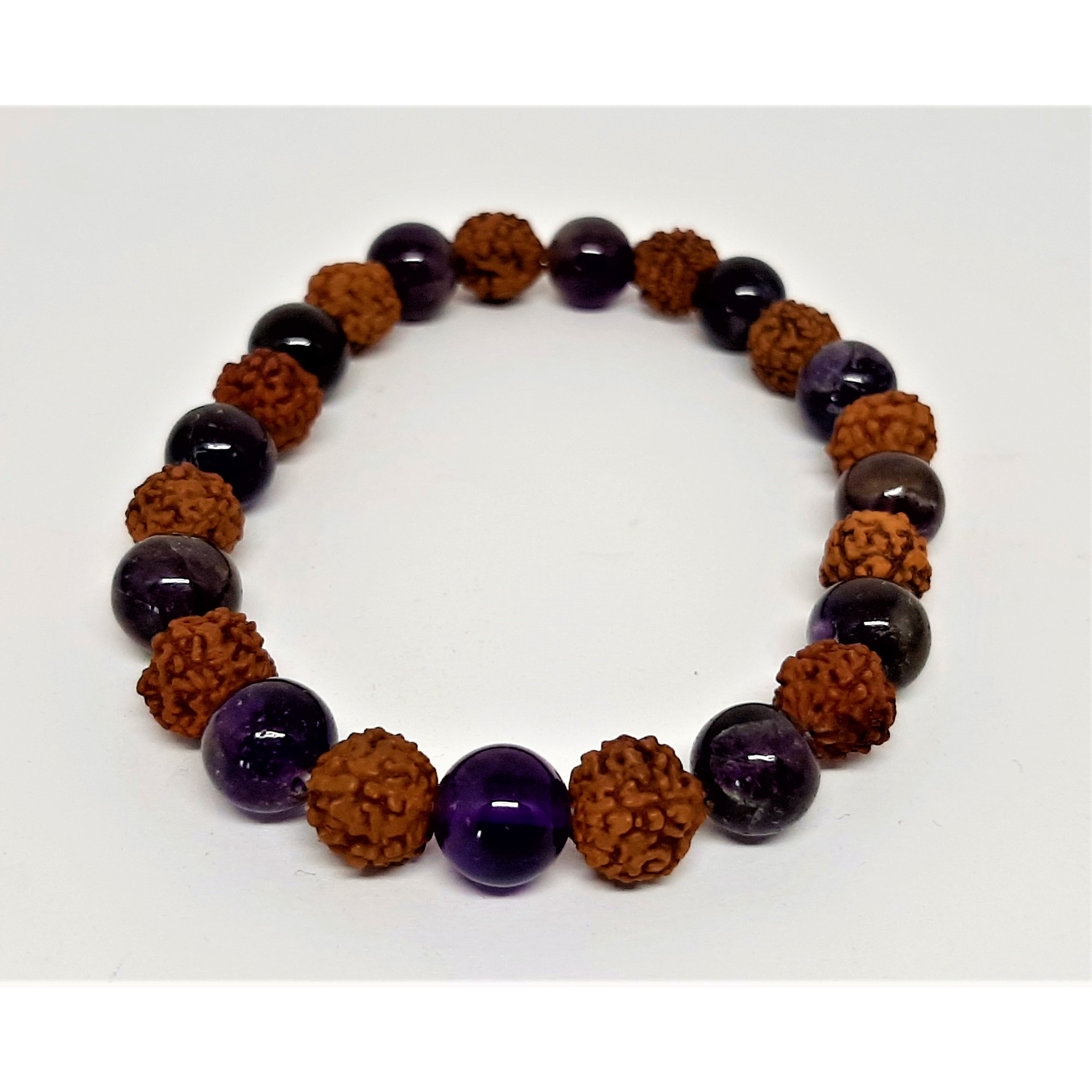 Braccialetto elastico con perline da 7mm di semi di Rudraksha e Ametista.