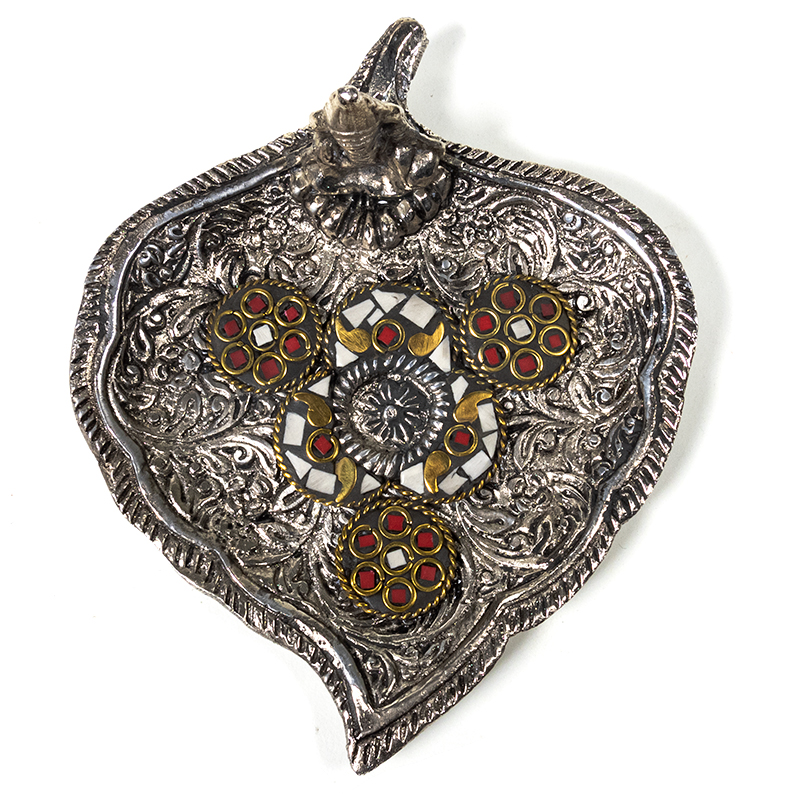 Porta incenso rotondo a forma di foglia con Ganesh, per bruciare coni di incenso.Con intarsio colorato a mosaico; i colori possono variare.