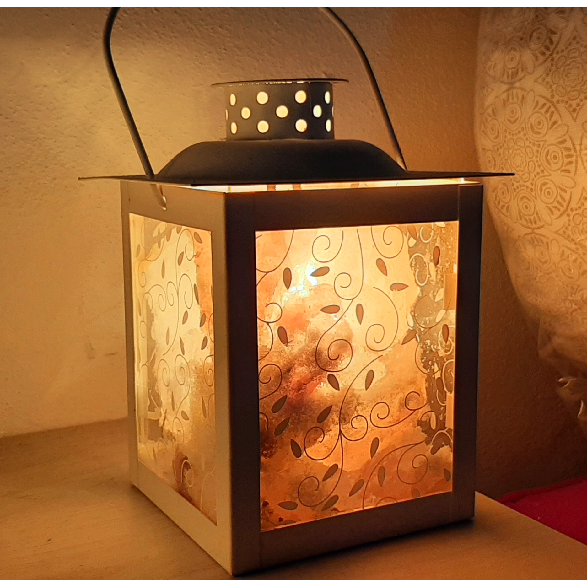 Una lanterna speciale con all'interno cristalli di sale rosa himalayano. Stile elegante e classico per illuminare e allo stesso purificare il tuo ambiente.