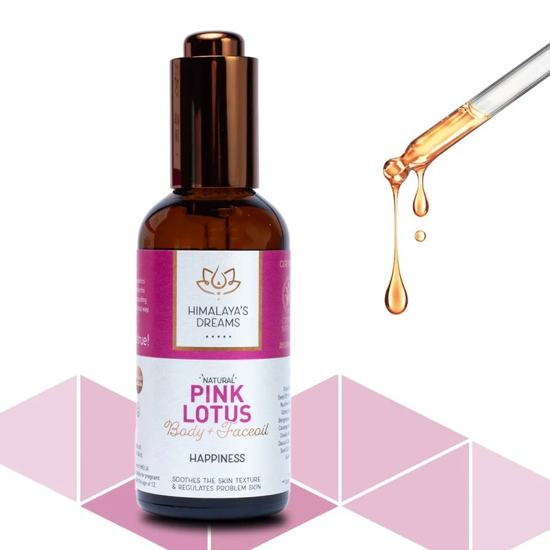 Himalaya's Dreams Pink Lotus / Happiness olio corpo e viso con lo squisito aroma di loto rosa. Con olio di crusca di riso, ottimo per pelli sensibili per le sue proprietà idratanti ed esfolianti. Con olio di ylang ylang, noto per ridurre lo stress, l'ansia, la tristezza, la tensione e l'insonnia.