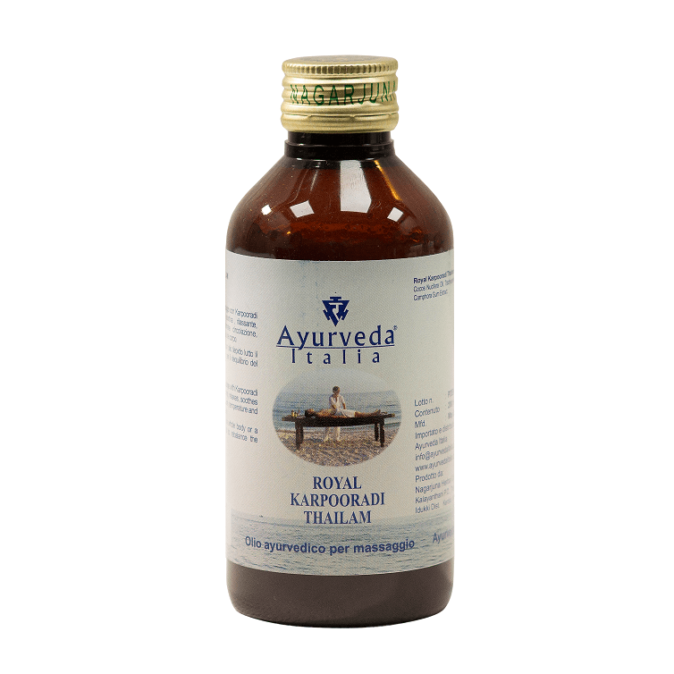 Il Karpooradi Thailam contiene fra gli altri ingredienti olio di cocco e canfora. Fragrante, rinfrescante e rubefacente, stimola la circolazione sanguigna della pelle. E’ molto efficace laddove si necessita di un’azione analgesica rapida ed in molti problemi di pelle. La letteratura ayurvedica lo consiglia per tutti i problemi connessi ai traumi sportivi quali edemi, contusioni, strappi, slogature , adatto anche ai dolori reumatici, muscolari ed articolari. Azione sui dosha: riduce vata e kapha