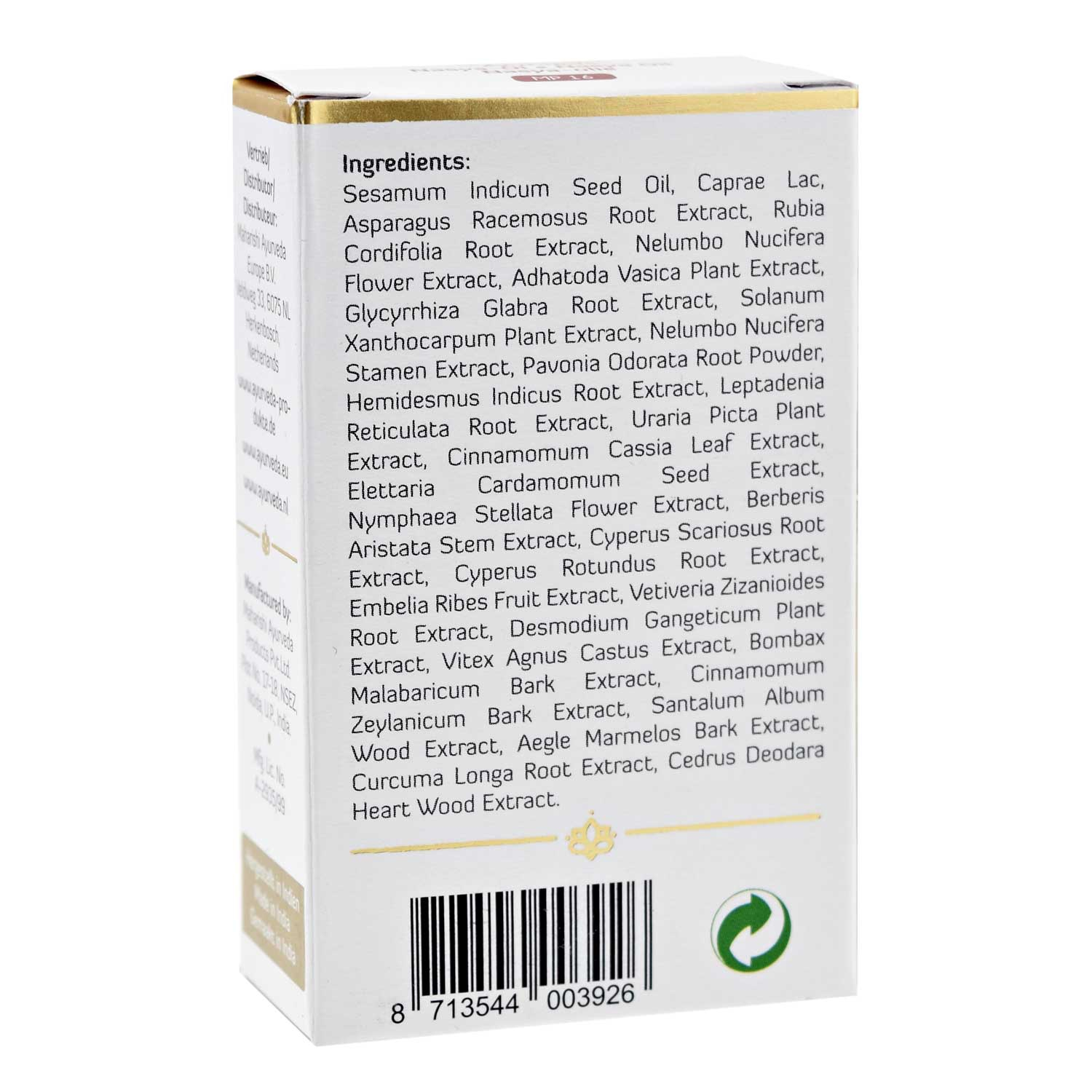 olio di sesamo, latte di capra, Nelumbium speciosum, radice tintoria indiana, legno di sandalo bianco, alloro indiano, crespino indiano, liquirizia, noce di Malabar, cardamomo, frutto Embelia, frutto Bela, malva palustre profumata, erba Vetivert, erba noce, salsapariglia , Salparni, Leptadenia reticulata, Uraria picta, cedro dell'Himalaya, Shatavari (asparago indiano), agnocasto , belladonna a bacca gialla , albero del cotone rosso, cypriol, cannella, ninfea, curcuma.