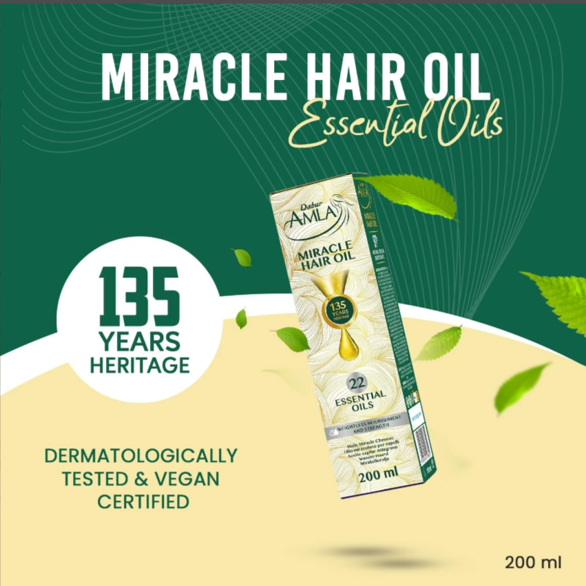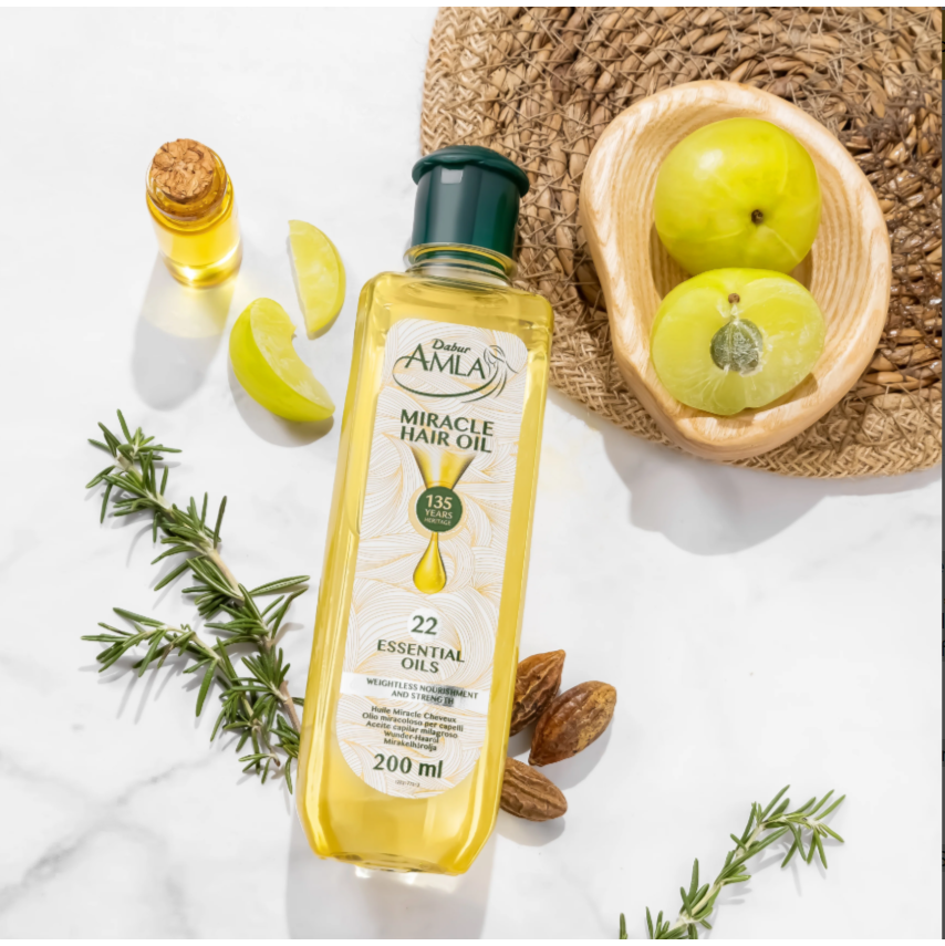 Dabur Amla Miracle Oil, una bottiglia da 200 ml ricca delle proprietà benefiche di 22 oli essenziali ayurvedici, pensata per nutrire, rafforzare,