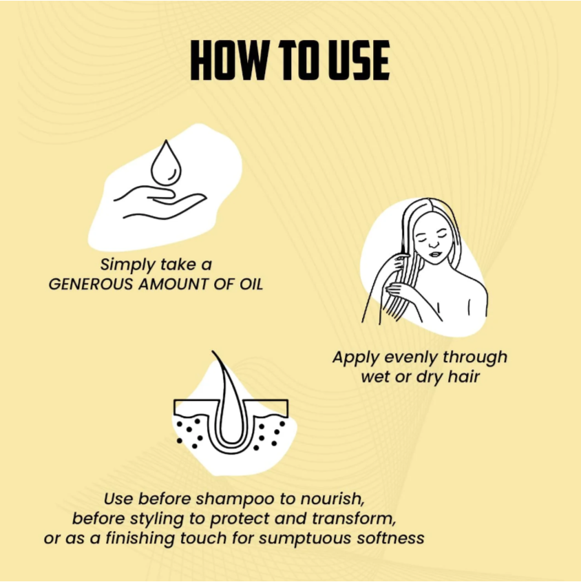 Massaggiare una generosa quantità di olio sui capelli e sul cuoio capelluto. Lasciare agire per tutta la notte o per qualche ora, quindi lavare.