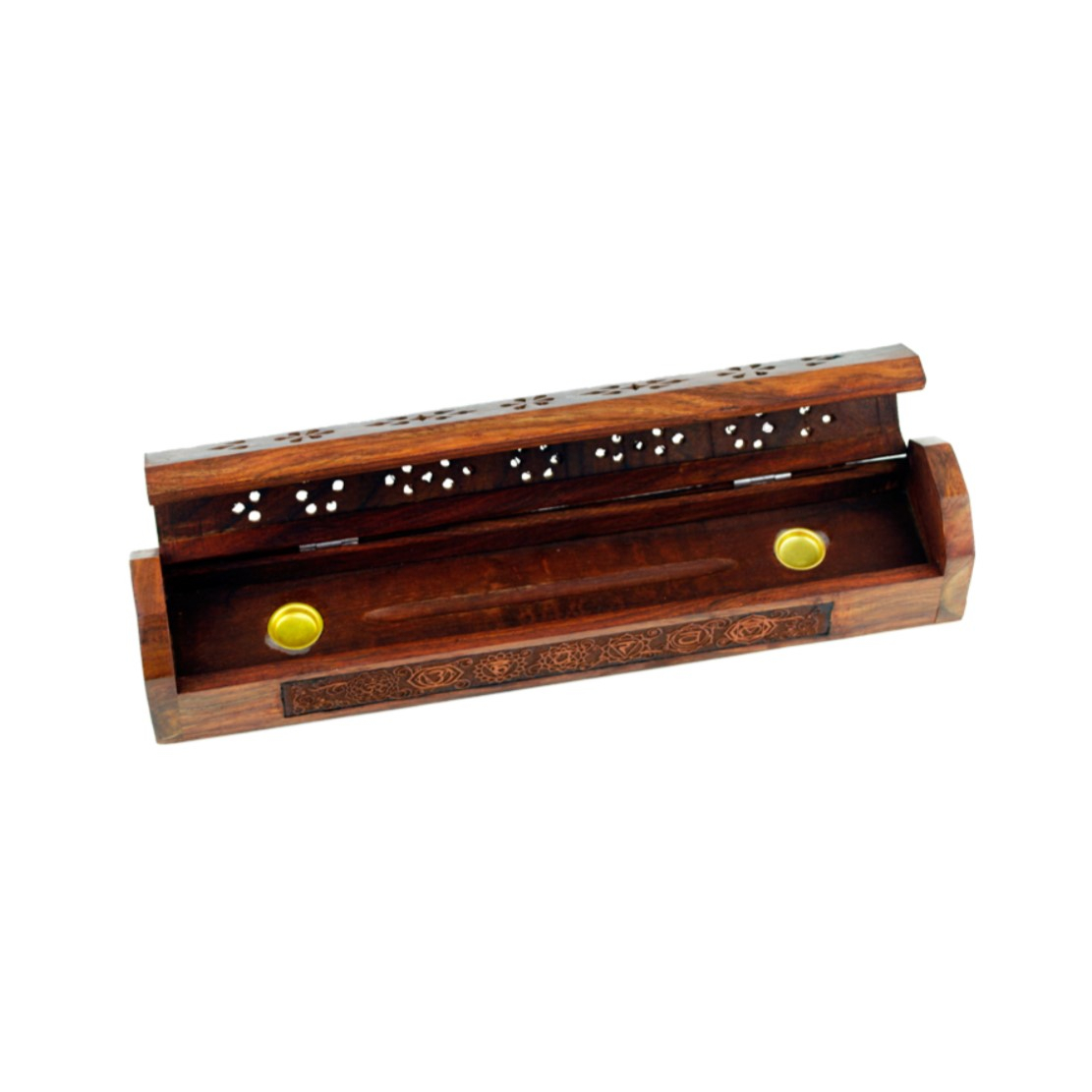Dotato di fori per bastoncini da entrambe le estremità; man mano che l'incenso brucia, la cenere cadrà direttamente dentro la scatola. Munito, nella parte bassa, di apposito contenitore dove riporre gli incensi di scorta.