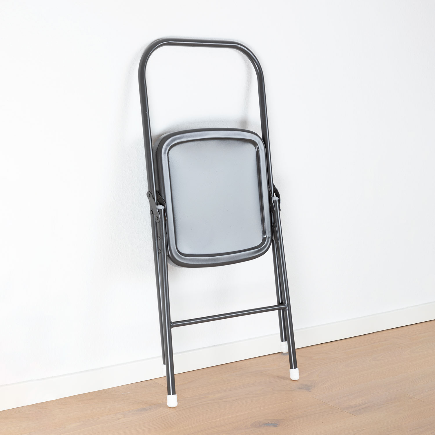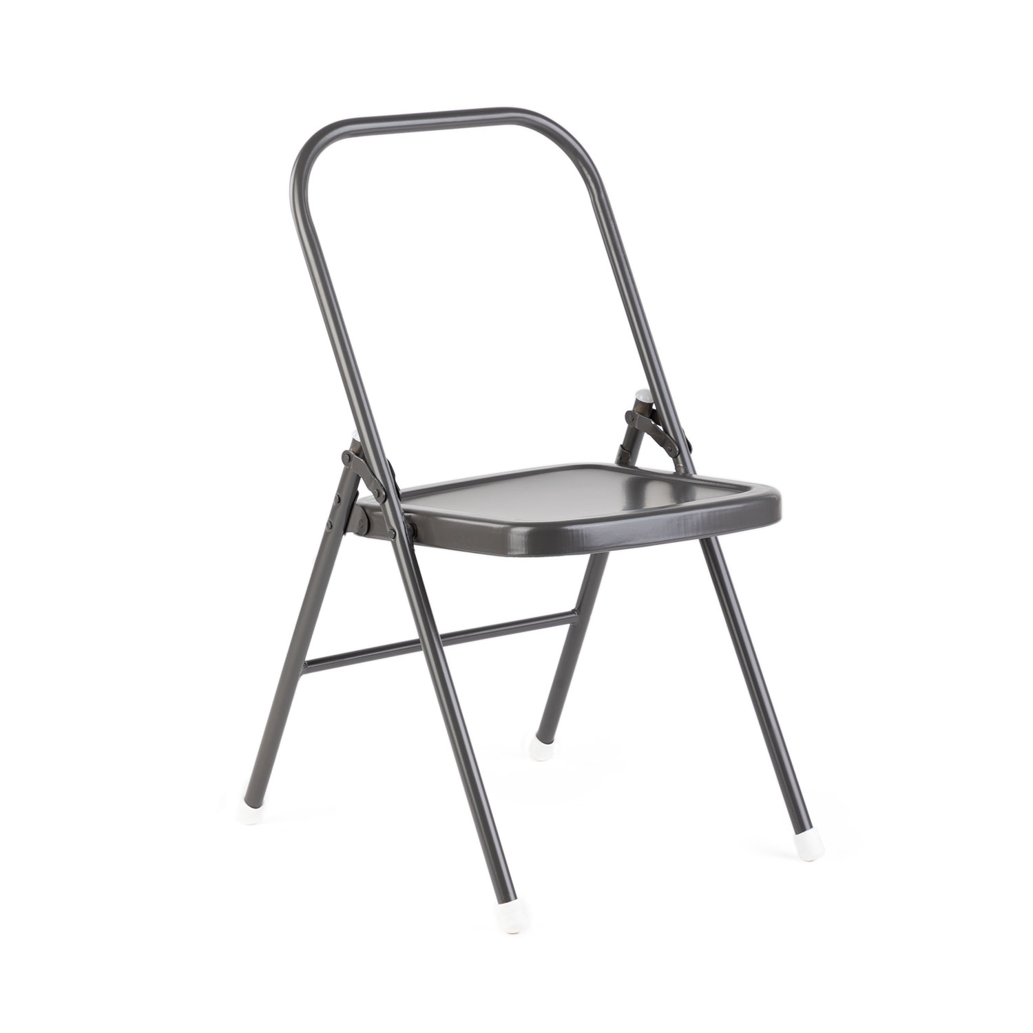 La sedia può essere ripiegata e riposta per risparmiare spazio. Ha una struttura in metallo, una seduta in metallo e bordi arrotondati. La traversa anteriore, presente su alcune sedie da yoga, è stata qui omessa, in modo che esercizi come l'aratro (Halasana) o la spalla (Salamba Sarvangasana) possano essere eseguiti senza problemi.