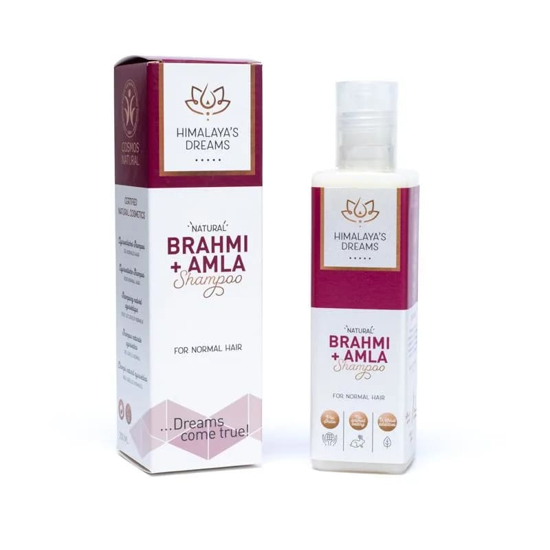 Shampoo a base di erbe certificato COSMOS Natural per capelli normali, detergente e nutriente, combatte la caduta dei capelli, l'ingrigimento e la crescita lenta dei capelli, nessun test sugli animali o ingredienti, nessun additivo artificiale, parabeni, solfati o silicone, commercio equo e solidale.