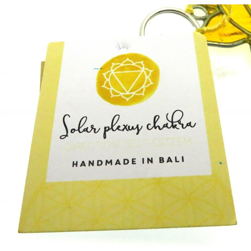 L'etichetta oscillante sull'acchiappasole fornisce informazioni sul Chakra del plesso solare e sul suo significato.