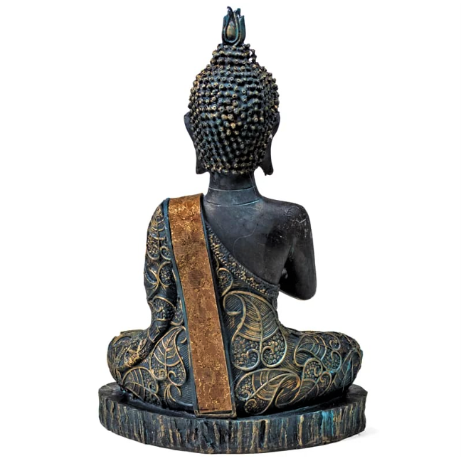 Buddha in stile tailandese con look vintage e mudra (gesto della mano) della preghiera. Abiti decorati con foglie di albero della Bodhi.