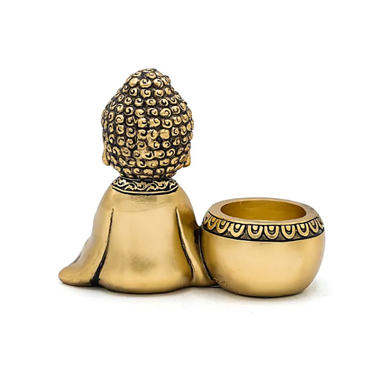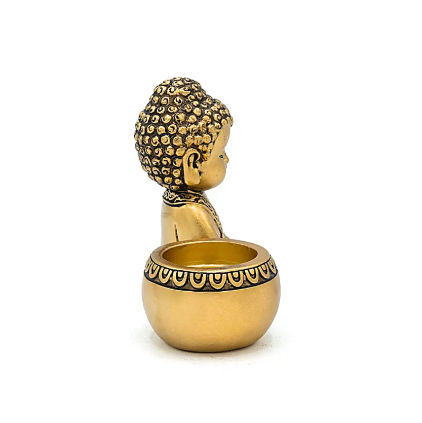 Gold-coloured tealight holder with a small meditating Buddha and a candle holder beside it. The soft candlelight enhances the serene expression of the figure. The Buddha traditionally symbolises inner peace, wisdom and balance.