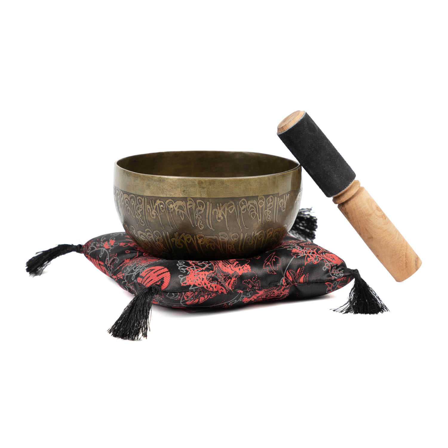 Le campane tibetane, finemente intarsiate, sono disponibili in diverse misure, ciascuna con un motivo specifico. Le campane tibetane vengono fornite con un cuscino e un percussore coordinati.