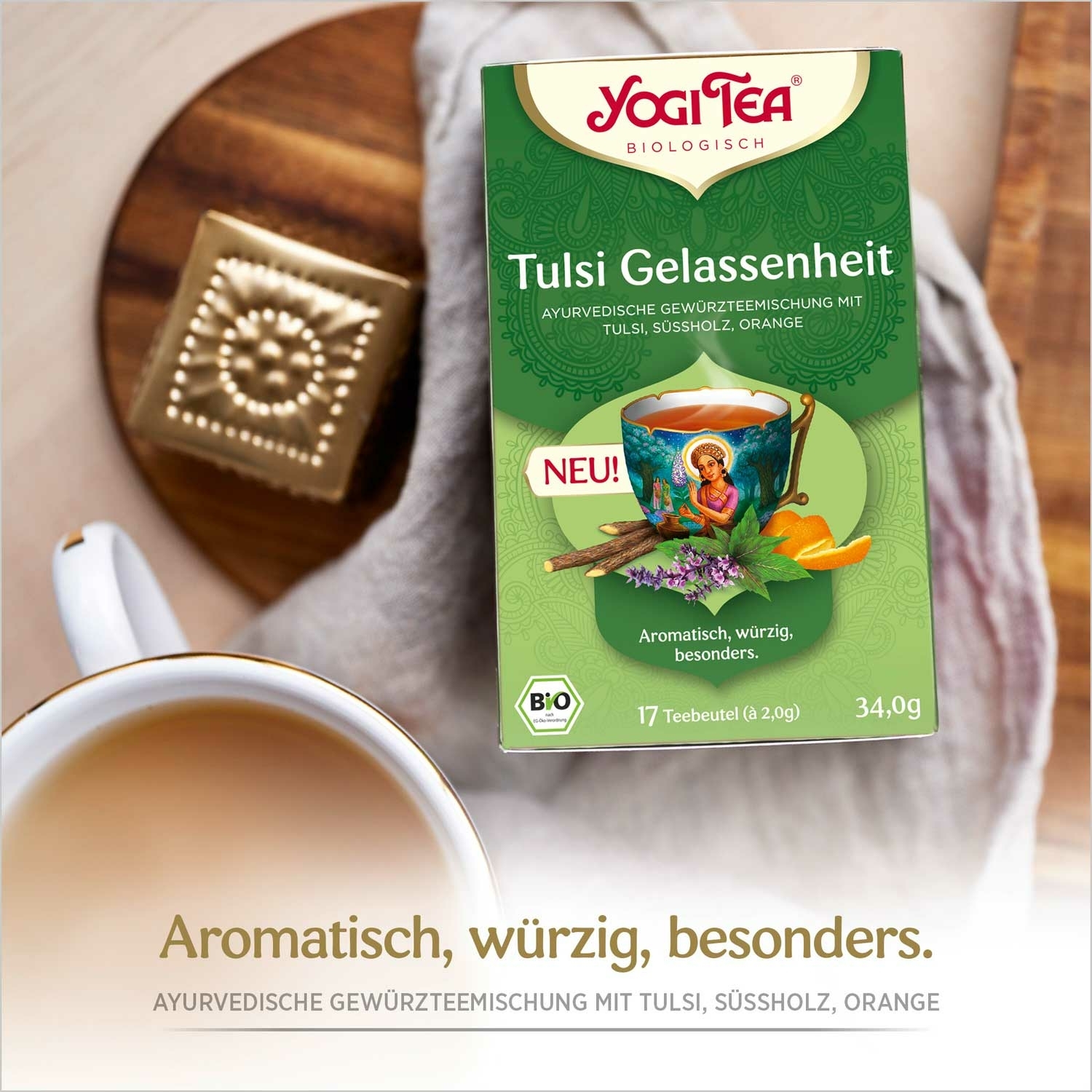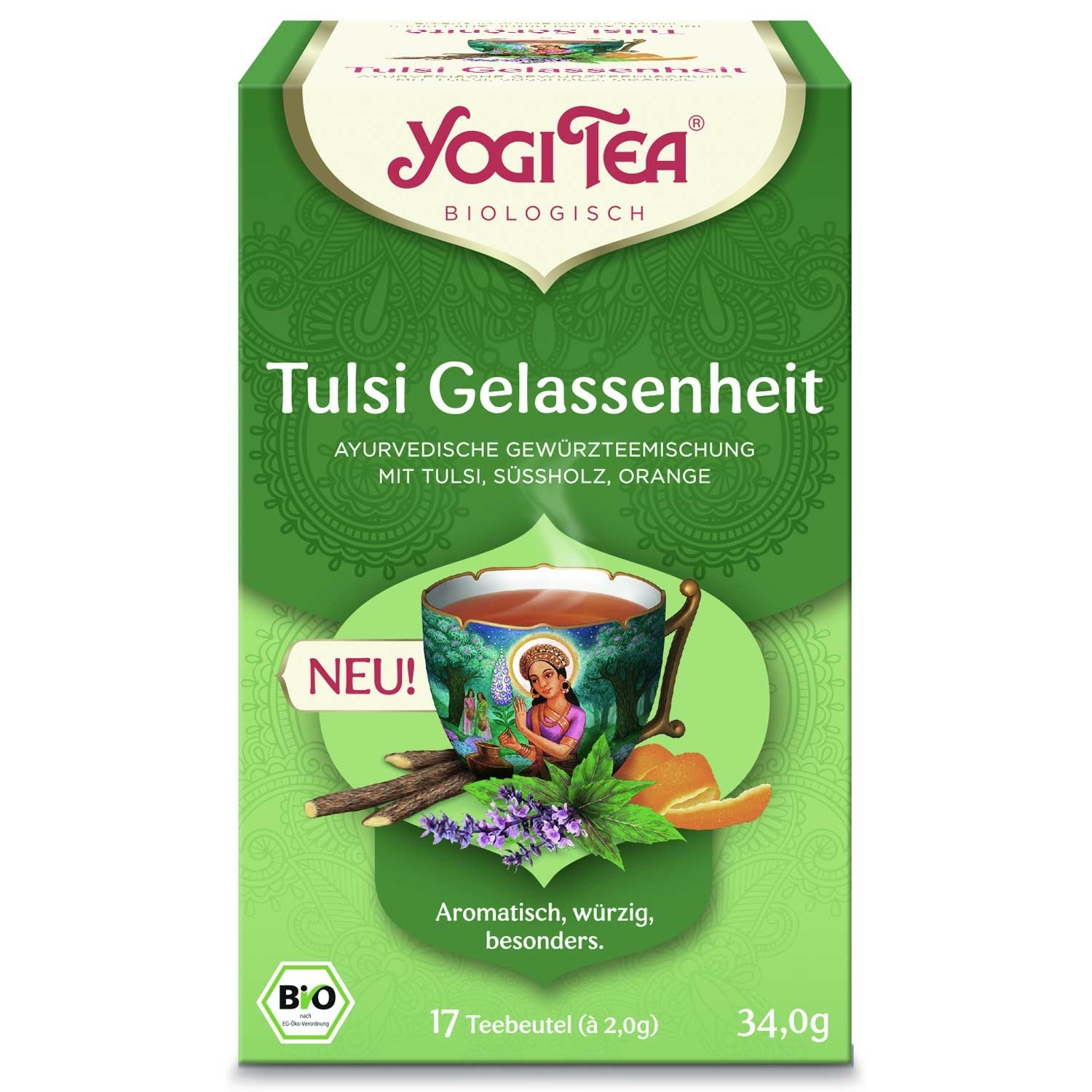 Questo Yogi Tea unico è un vero tesoro! La speciale composizione del tè combina il prezioso Tulsi, conosciuto in Ayurveda anche come la "Regina delle erbe" o "Basilico Santo" e molto apprezzato da millenni, con note fruttate di arancia e liquirizia. Il risultato è una deliziosa miscela di tè per un sacro momento di relax.