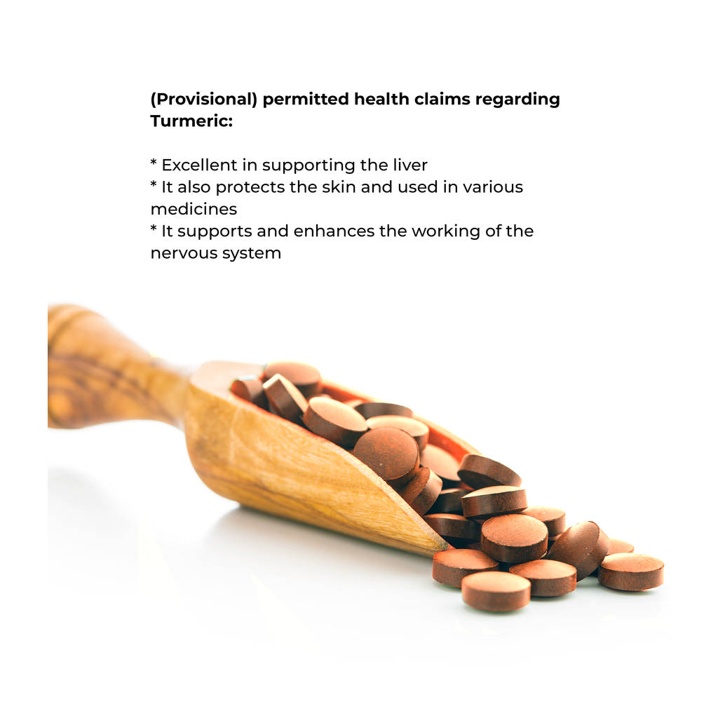 Compressa di curcuma Plus: la curcumina, il componente all'interno della curcuma, ha proprietà antinfiammatorie, antisettiche e antibatteriche. È meglio combinare la curcuma con il pepe nero, poiché la curcumina mostra una maggiore biodisponibilità o assorbimento in presenza di piperina, che è uno dei composti attivi del pepe nero.