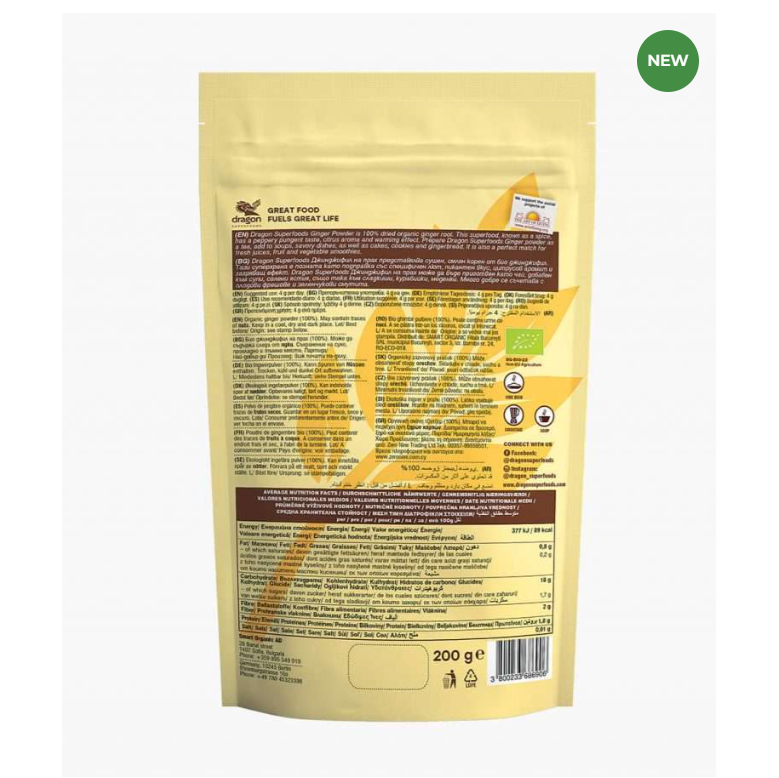 Lo zenzero in polvere è radice di zenzero essiccata al 100%. Questo superfood, noto anche come spezia, ha un sapore pungente e pepato, un aroma agrumato e un effetto riscaldante. Lo zenzero in polvere è un superfood perfetto per preparare una tisana, aggiungere a zuppe, piatti salati, torte, biscotti e pan di zenzero. È anche un abbinamento perfetto per succhi freschi, frullati di frutta e verdura.